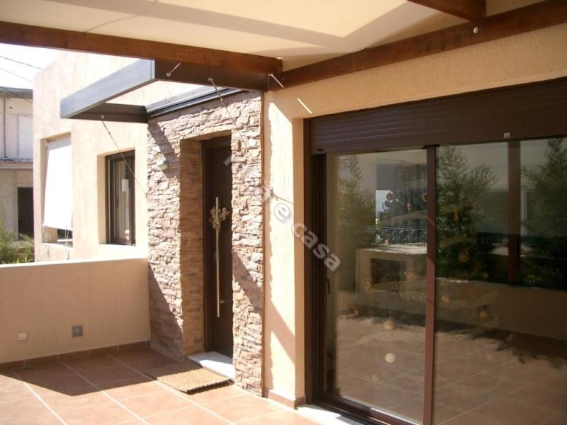 Κουφώματα – ρολά DORAL ηλεκτροστατικής βαφής (chocolate mat). Εξωτερικό καθιστικό με πέργκολα (ξύλο-πανί).